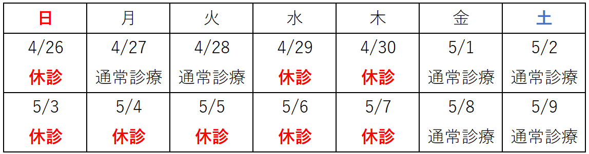 2026年ゴールデンウィークの診療時間についてお知らせ致します。